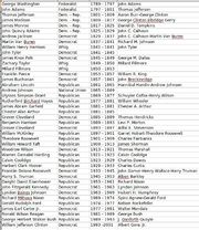 Spreadsheet of presidents, term dates, vice presidents, and party.